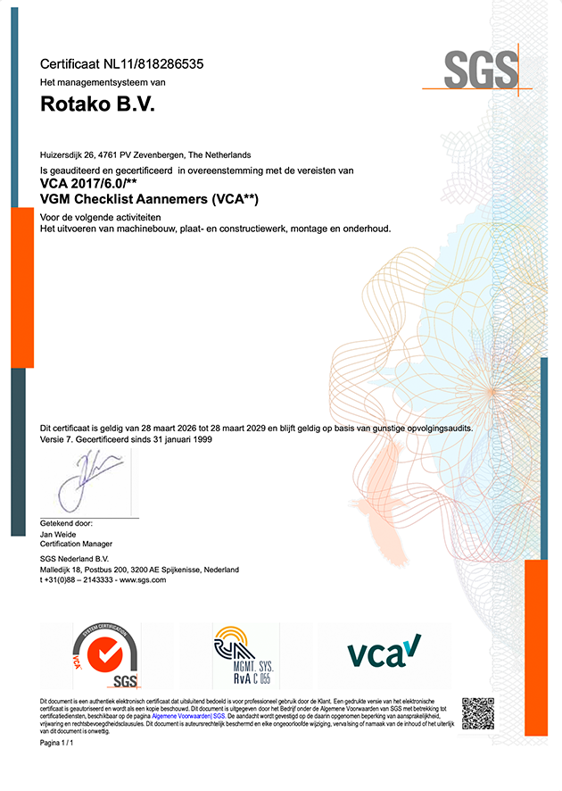 Omdat Rotako BV regelmatig bij opdrachtgevers werkt met onderaannemers zijn wij VCA** gecertificeerd.